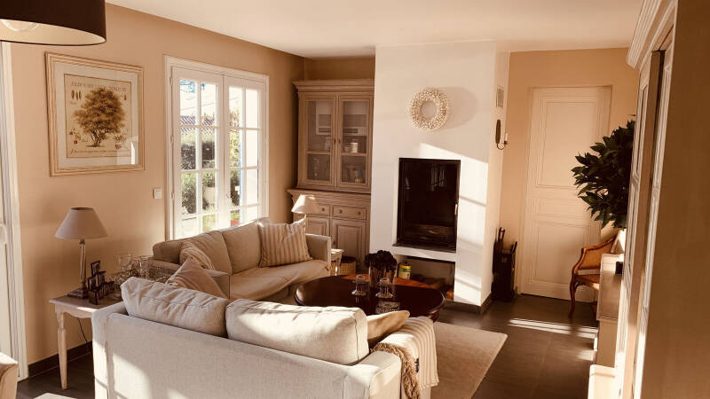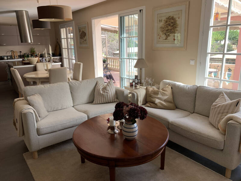 Stuen har peis og TV med AppleTV og internett. Det er flere direkte utganger til terrassen med fin oversikt over basseng og hage.