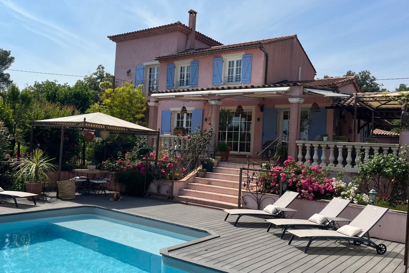 Huset er bygget midt på 1970-tallet, men ble påbygget i 2004 og videre renovert i 2022. Det har god standard og er på ca. 130 m2 over to plan. Det er en stor fliselagt terrasse rett utenfor stue og kjøkken med stort spisebord og salong, ellers flere steder hvor man kan sitte i sol eller skygge. Bassengområder har 8 solsenger i tillegg til solstoler og omkledningsrom, samt en dusj.